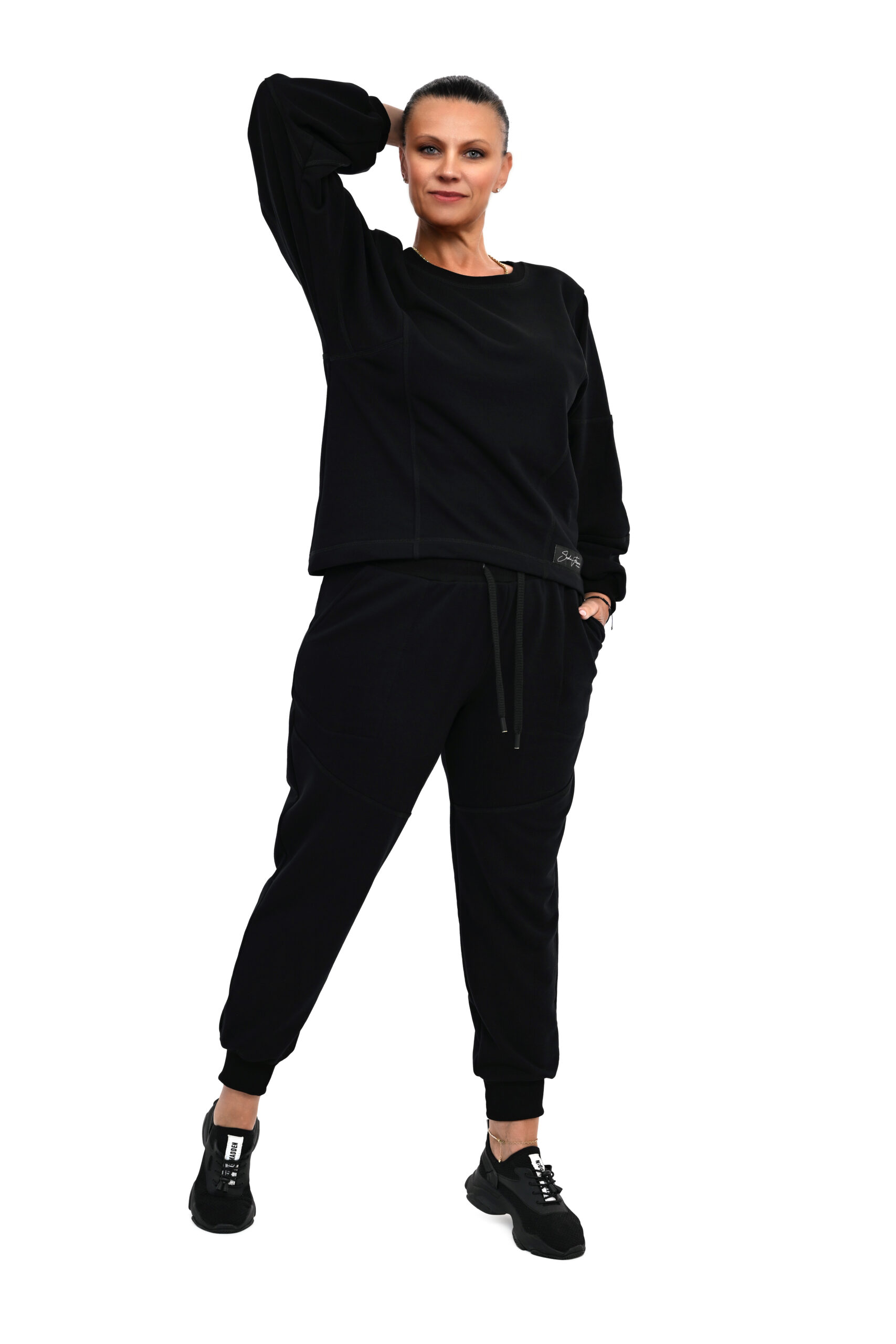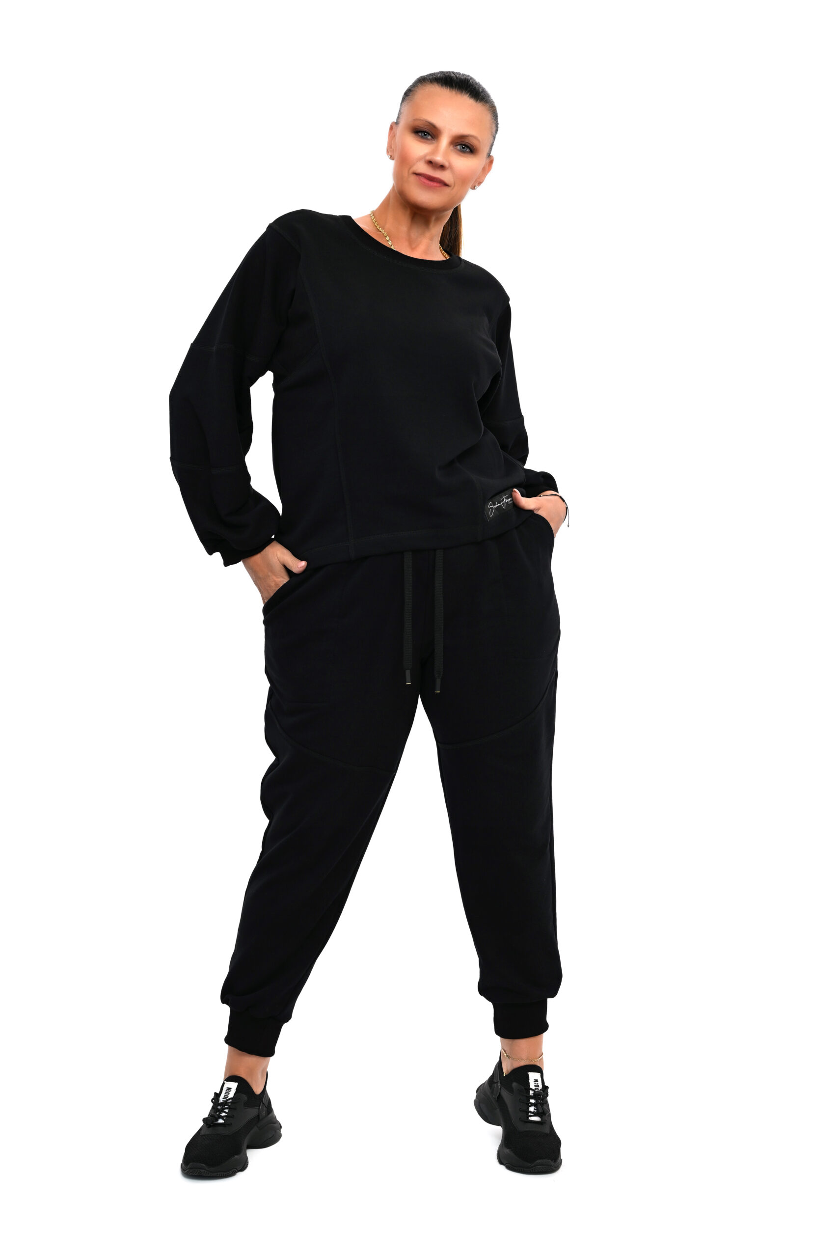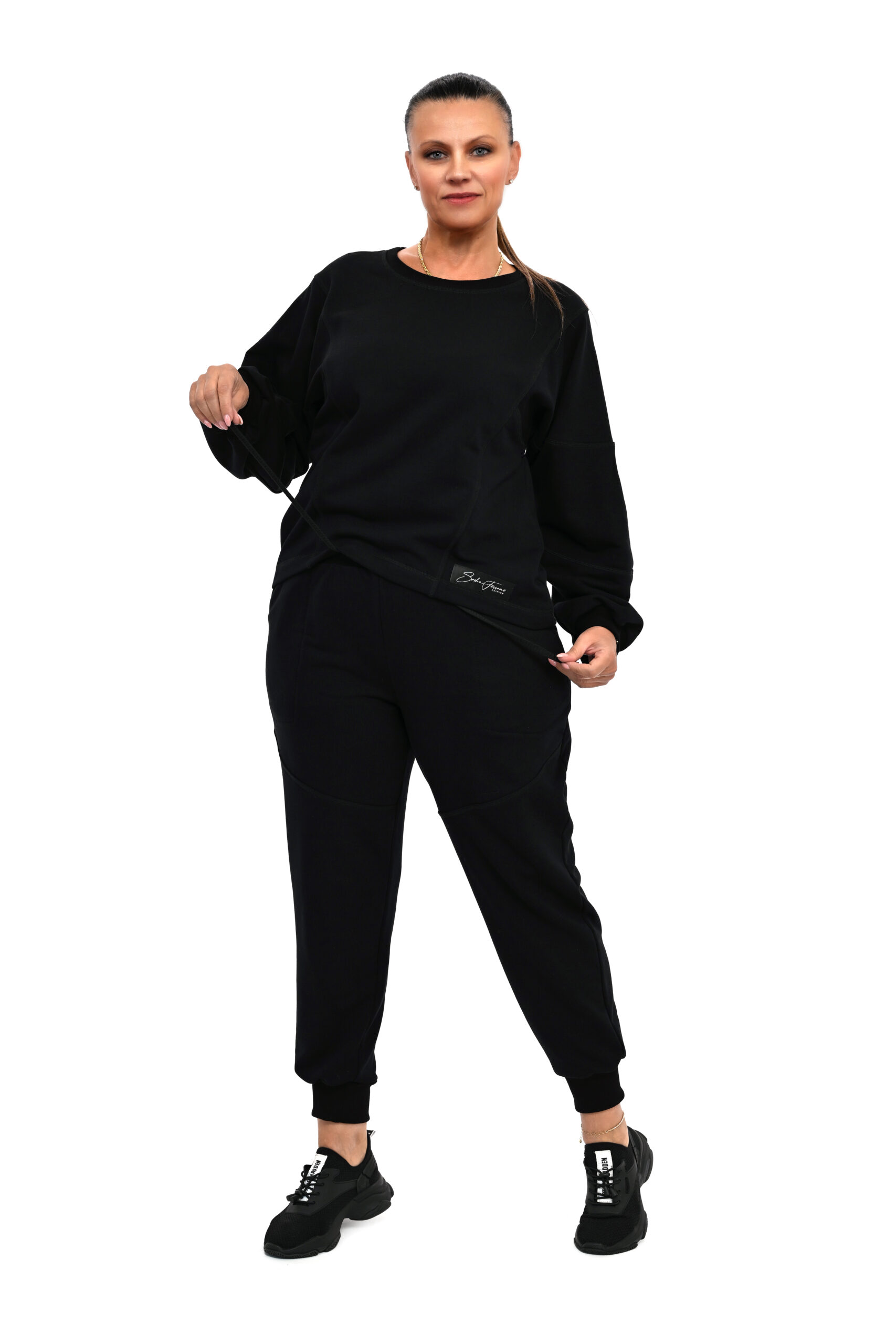 Designerski dres AMALFI czarny uszyty z dba艂o艣ci膮 o szczeg贸艂y z 艂adnymi dekoracyjnymi przeszyciami nie z grubej dzianiny trzy nitkowej .