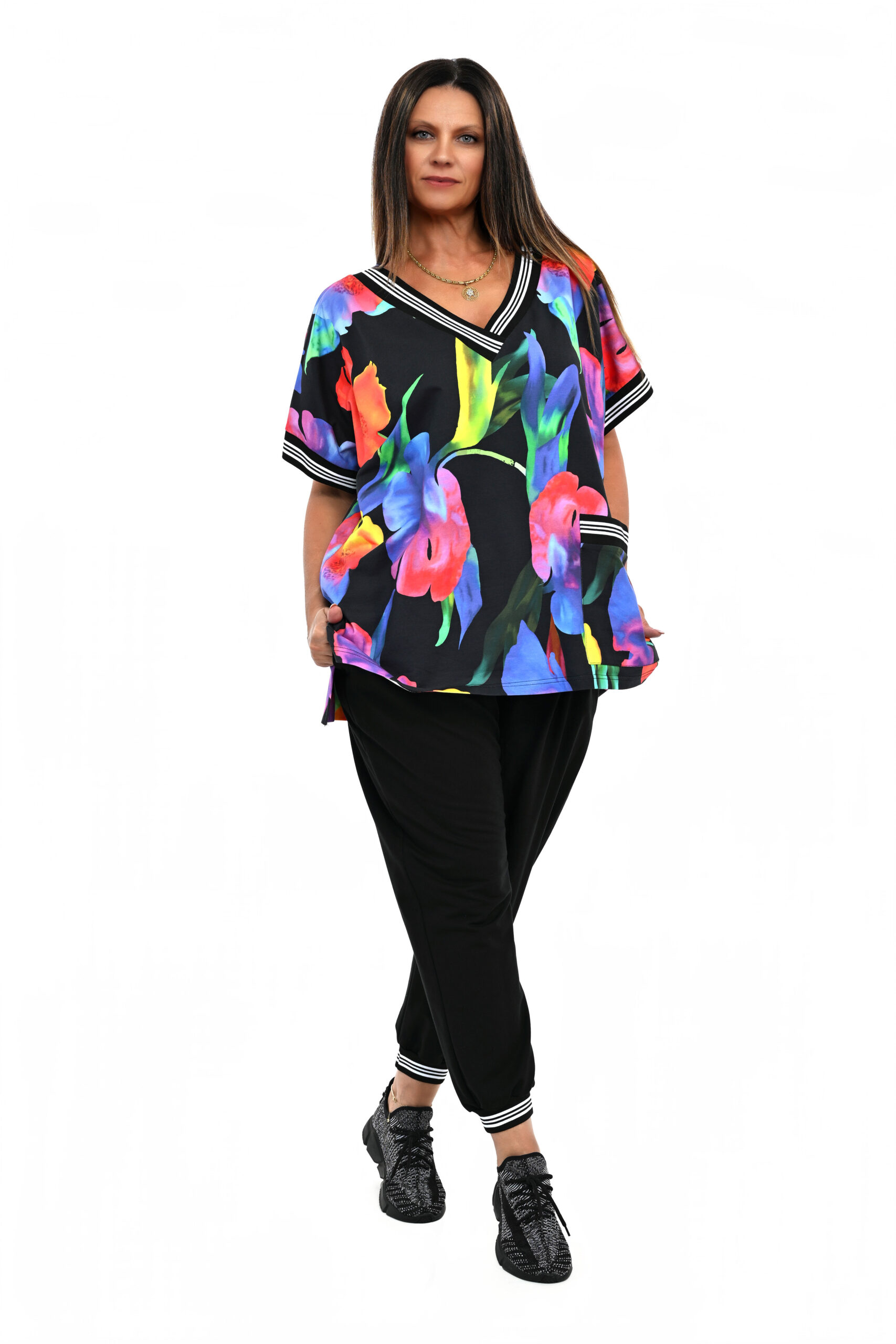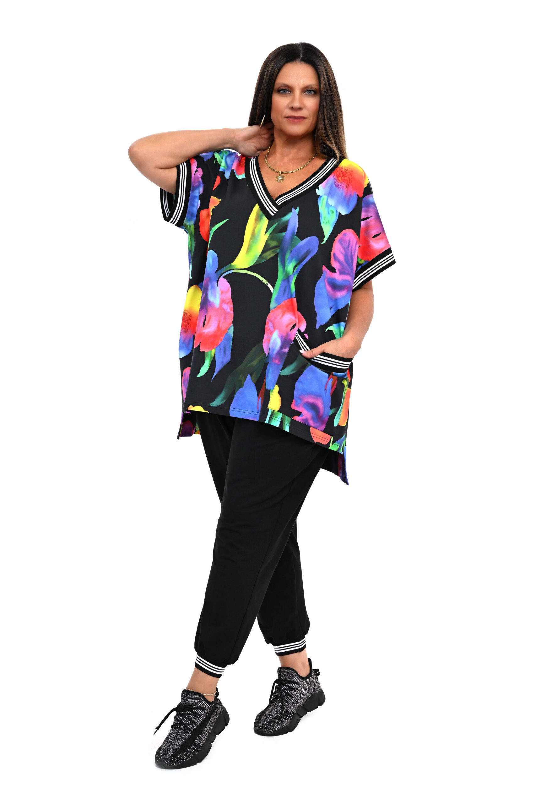 Dziewczyny, szukajcie dobrej jakości dresów? Zapraszamy, mamy w sprzedaży. Nasz dres Kreta bluza neonowe kwiaty z krótkim rękawem , bawełniany z domieszką elastanu ,utrzymany w modnej stylistyce