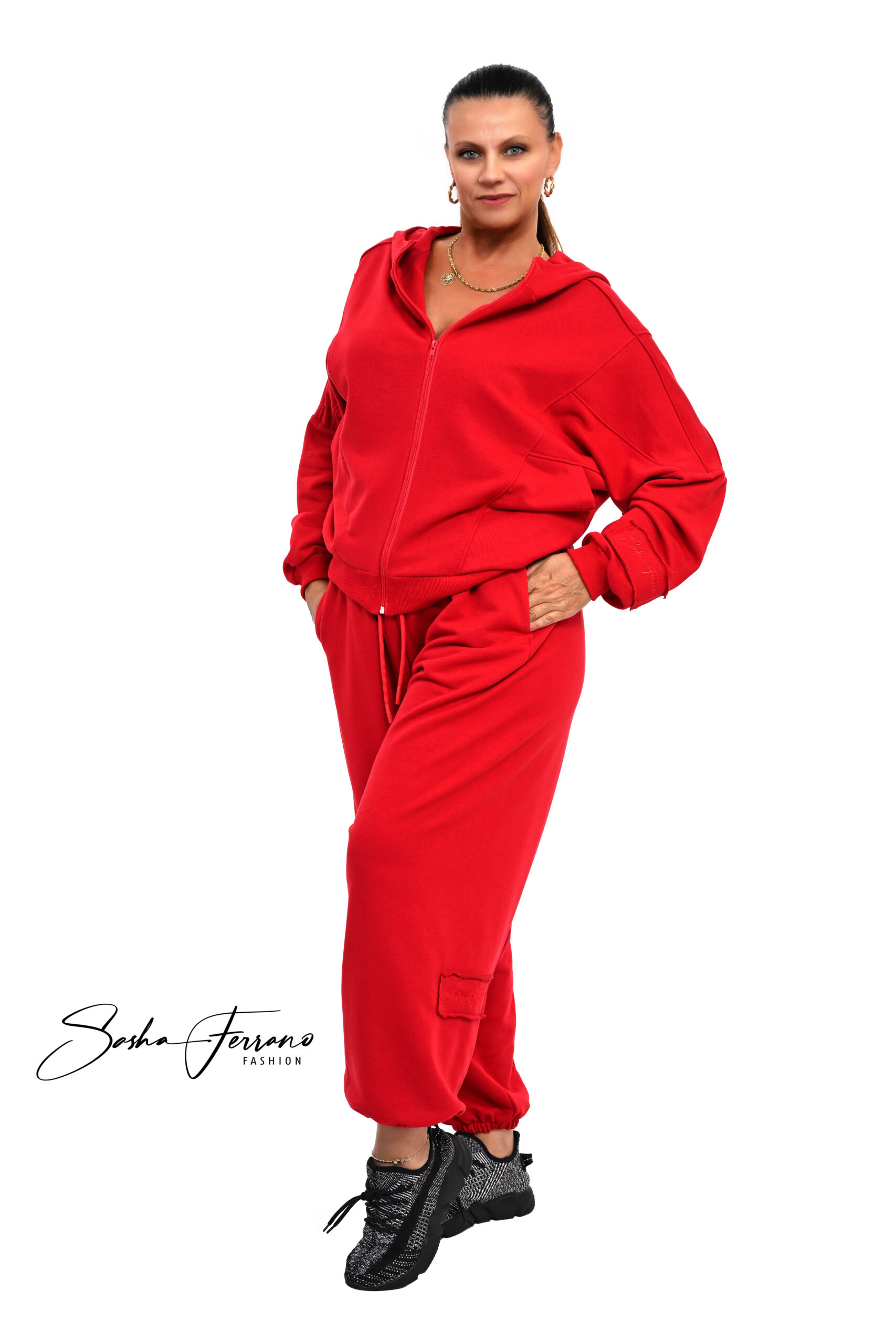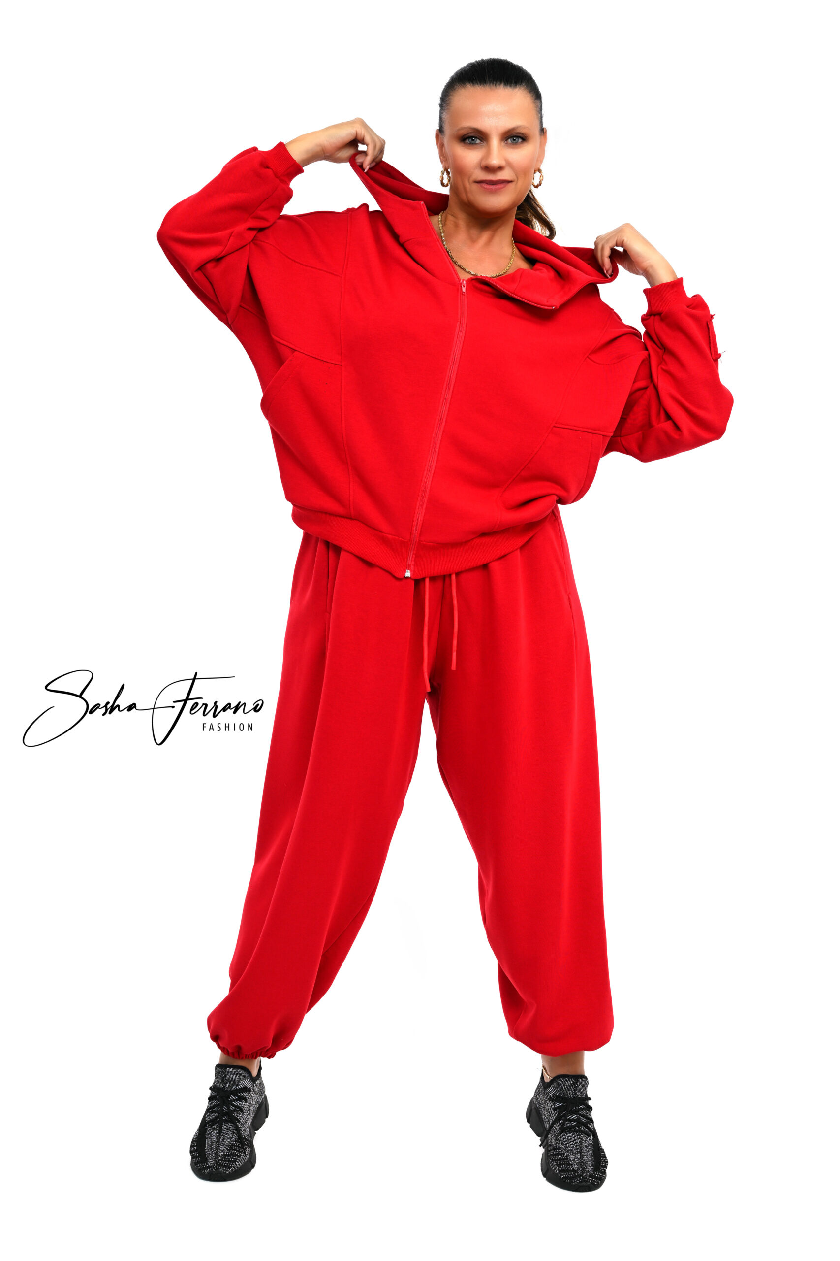 Awangardowy dwuczęściowy bawełniany dres ROMA , OVERSIZE-40/50 kolor czerwony, rozpinana bluza , podwójny kaptur ze stójką, wydłużony delikatnie rękawek. Spodnie to sztos modowy luźne pumpy w mało spotykanym kroju szwy tylko w środku, więc wszystko razem tworzy super nowoczesną stylizację.