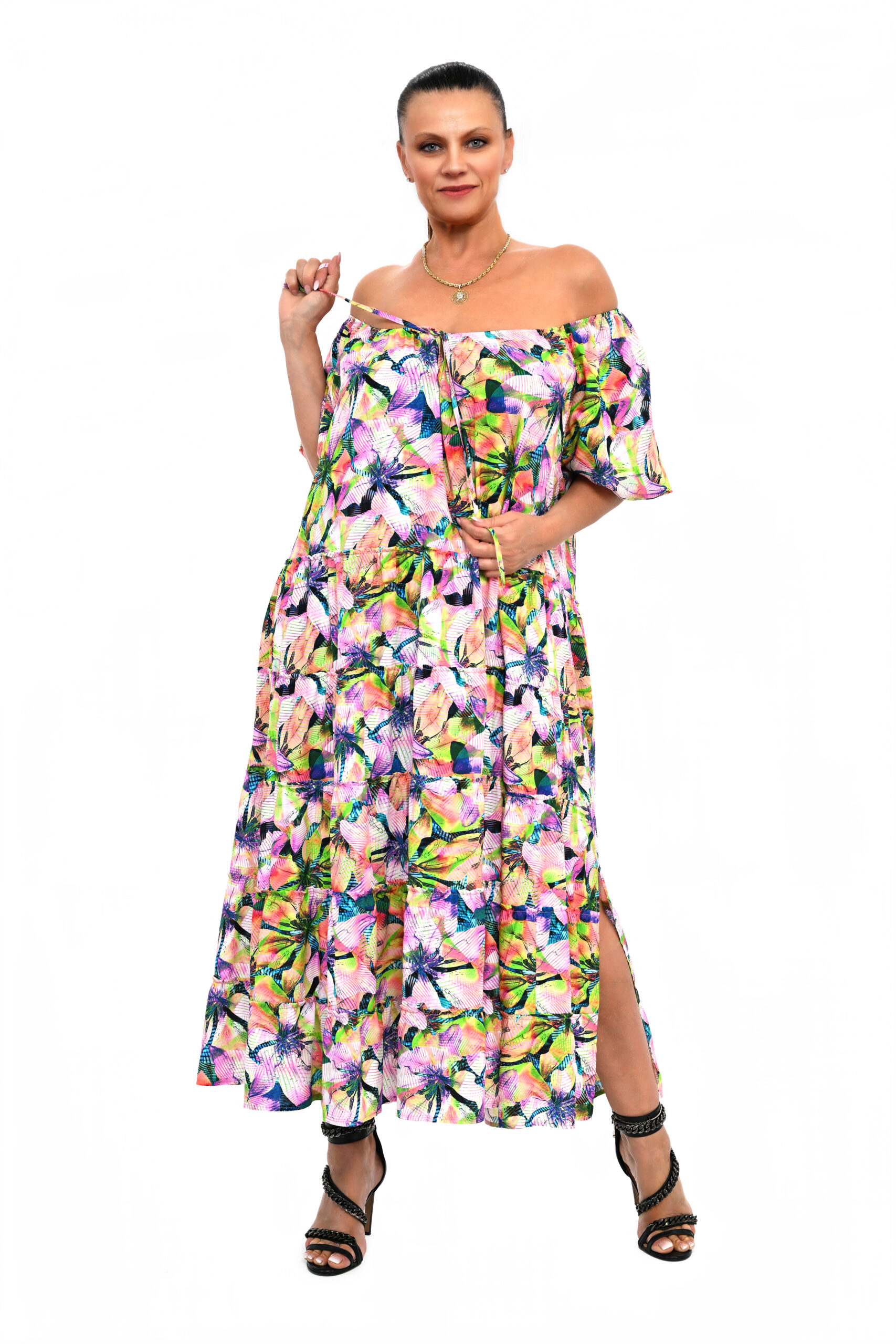 Letnia stylowa sukienka SARAH w kwiaty rozm. OVERSIZE-42/54 jest najlepsza propozycją na wiosnę lato, fason trapezowy z pięcioma stylowo umarszczonymi falbanami i rozcięciami po bokach, uszyta z wiskozy 100 %