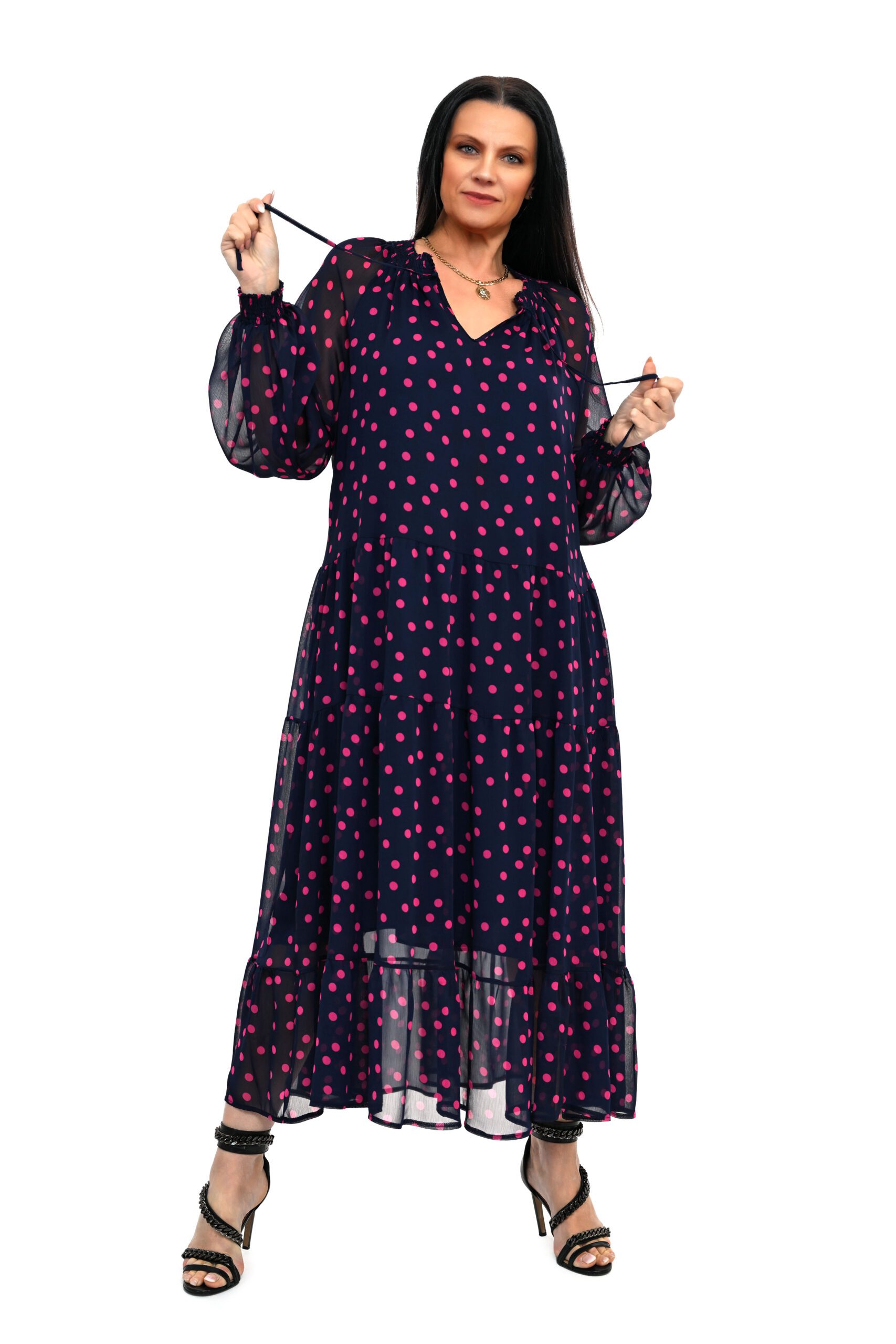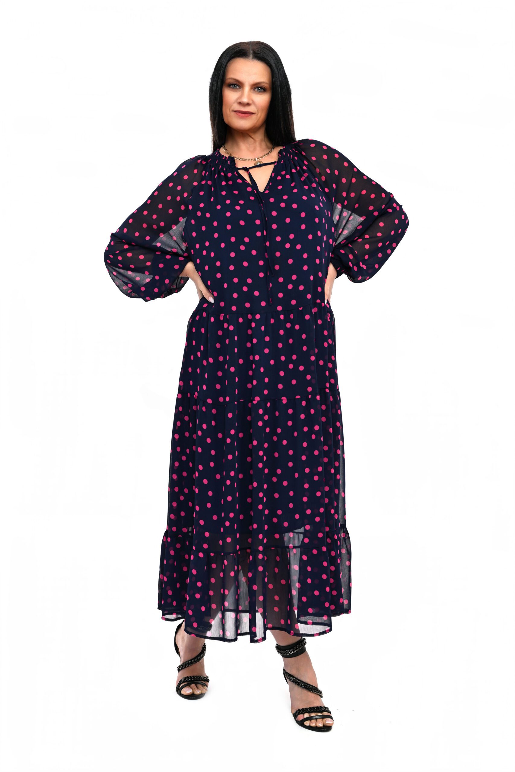 Stylowa szyfonowa, długa, zwiewna sukienka VELA oversize-42/54 na wiskozowej podszewce. Gumowana stójka i mankiety bufiastych rękawów.
