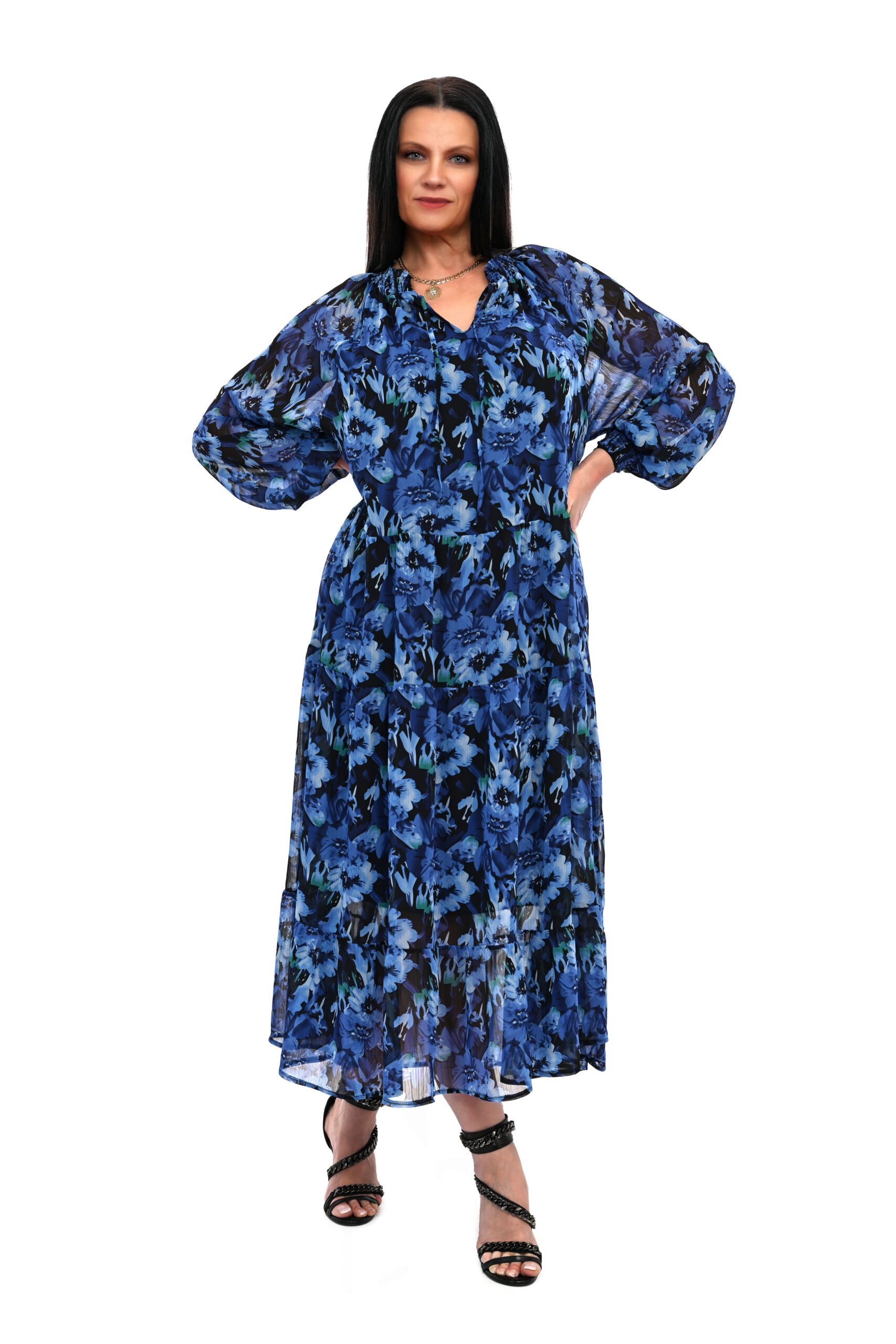 Stylowa szyfonowa, długa, zwiewna sukienka VELA oversize-42/54 w niebieskie kwiaty na wiskozowej podszewce. Gumowana stójka i mankiety bufiastych rękawów.