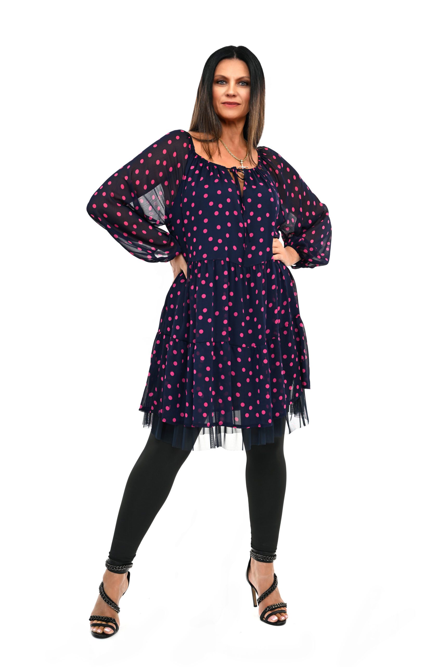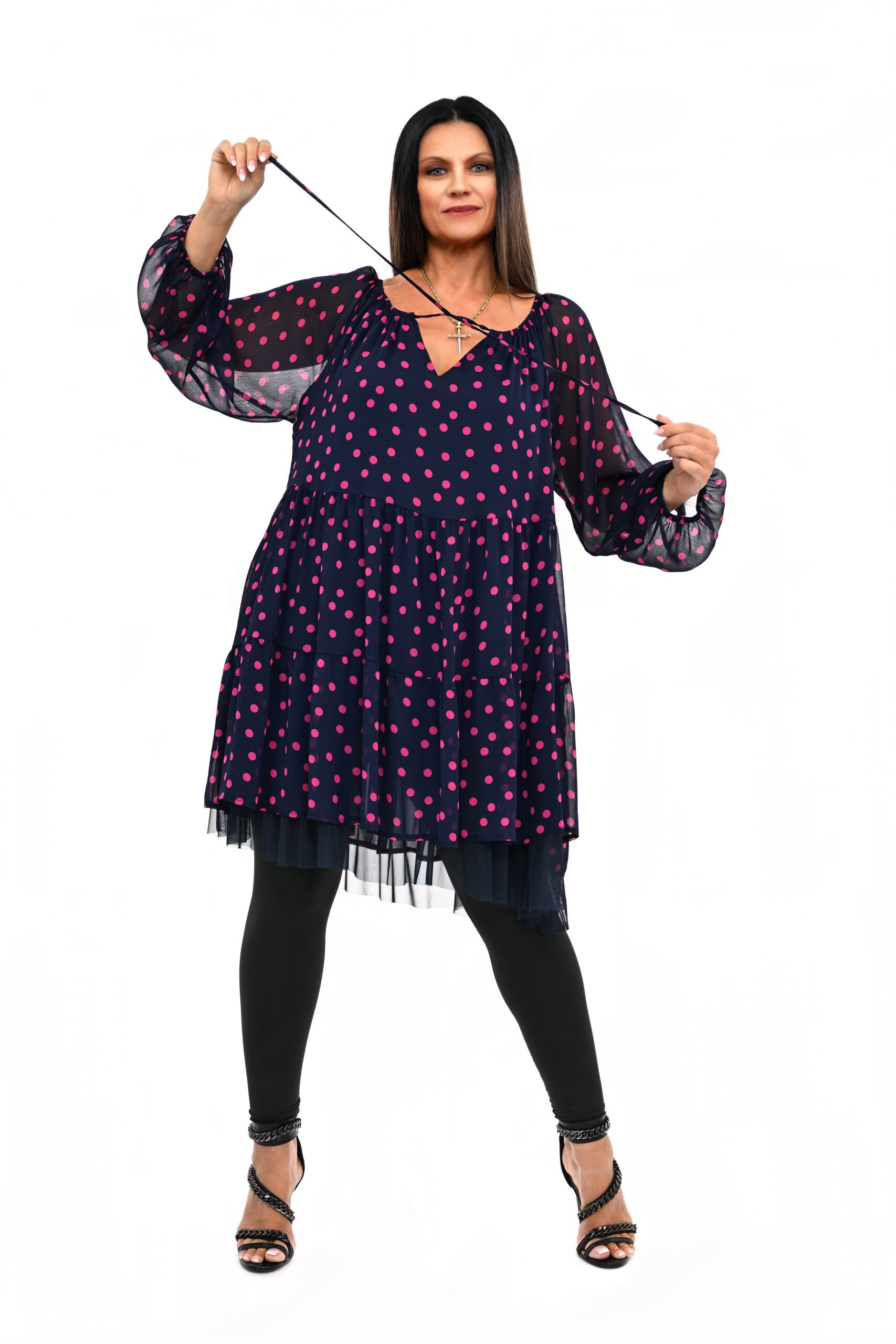 Stylowa szyfonowa sukienka FIFI granatowa w różowe grochy oversize 42/52 i co najważniejsze na podszewce z 100%-wiskozy . Sukienka uszyta w stylu hiszpańskim w dekolcie regulowana sznurkiem co dodaje jej wspaniałego widoku. Sukienka można powiedzieć jest całoroczna i pasuje na każdą okazję , świetnie wygląda z ramoneską lub krótką alpaką .